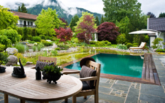 Naturmaterialien wie Granitsteinpflaster und Holz bieten einen wohnlichen Anblick und laden an warmen Tagen zum BarfuĂlaufen ein. Der natĂŒrlich gespaltene Findling mit Sedumbewuchs ist eine Augenweide in der wohlstrukturierten Gartenlandschaft.