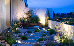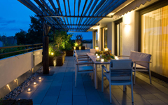 Ein Penthouse-Garten in zwei Bereichen: Ein reprĂ€sentativer AuĂenwohnraum mit Blick auf die Stadt und ein natĂŒrlich gestalteter Bereich mit asiatischen AnklĂ€ngen. Die fachgerechte Beleuchtung setzt den Dachgarten eindrucksvoll in Szene.