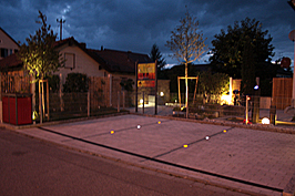 beleuchtete Pflastersteine als Parkplatzmarkierung und runde Dots als Wegemarkierung